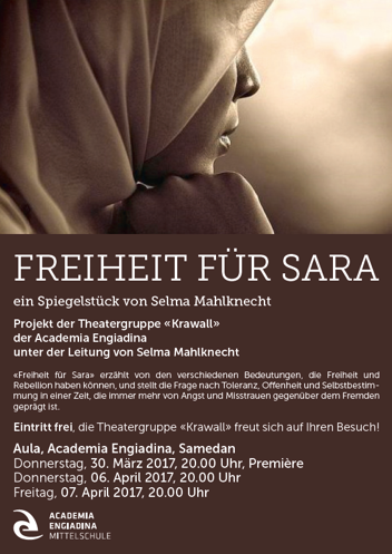 Aber das ist nur die eine Seite des Stücks. Es gibt nämlich auch noch die andere Sara. Auch sie ist siebzehn. Auch sie rebelliert. Auch sie glaubt an ihr Recht auf Freiheit. Aber diese Sara lebt in einem westlichen Land, in «unserer» Welt, von der wir glauben, dass sie bereits Freiheit für alle garantiert. Sara geht jedoch einen anderen Weg. Sie hat die Oberflächlichkeit und Konsumorientierung ihrer Mitmenschen satt. Sie sucht spirituellen Halt und findet ihn im Islam. Sie konvertiert. Ihre Familie und ihre Freunde reagieren entsetzt und mit Unverständnis. Fremde auf der Strasse pöbeln sie an. Aber Sara will nicht aufgeben.
